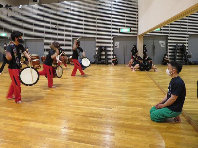公演に向け、合同で演奏する曲の指導に鼓童の石塚さんが